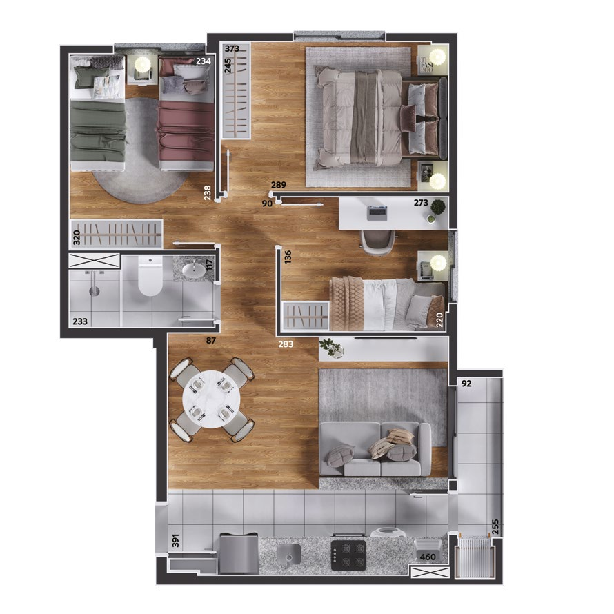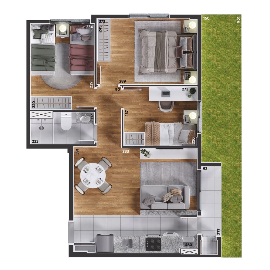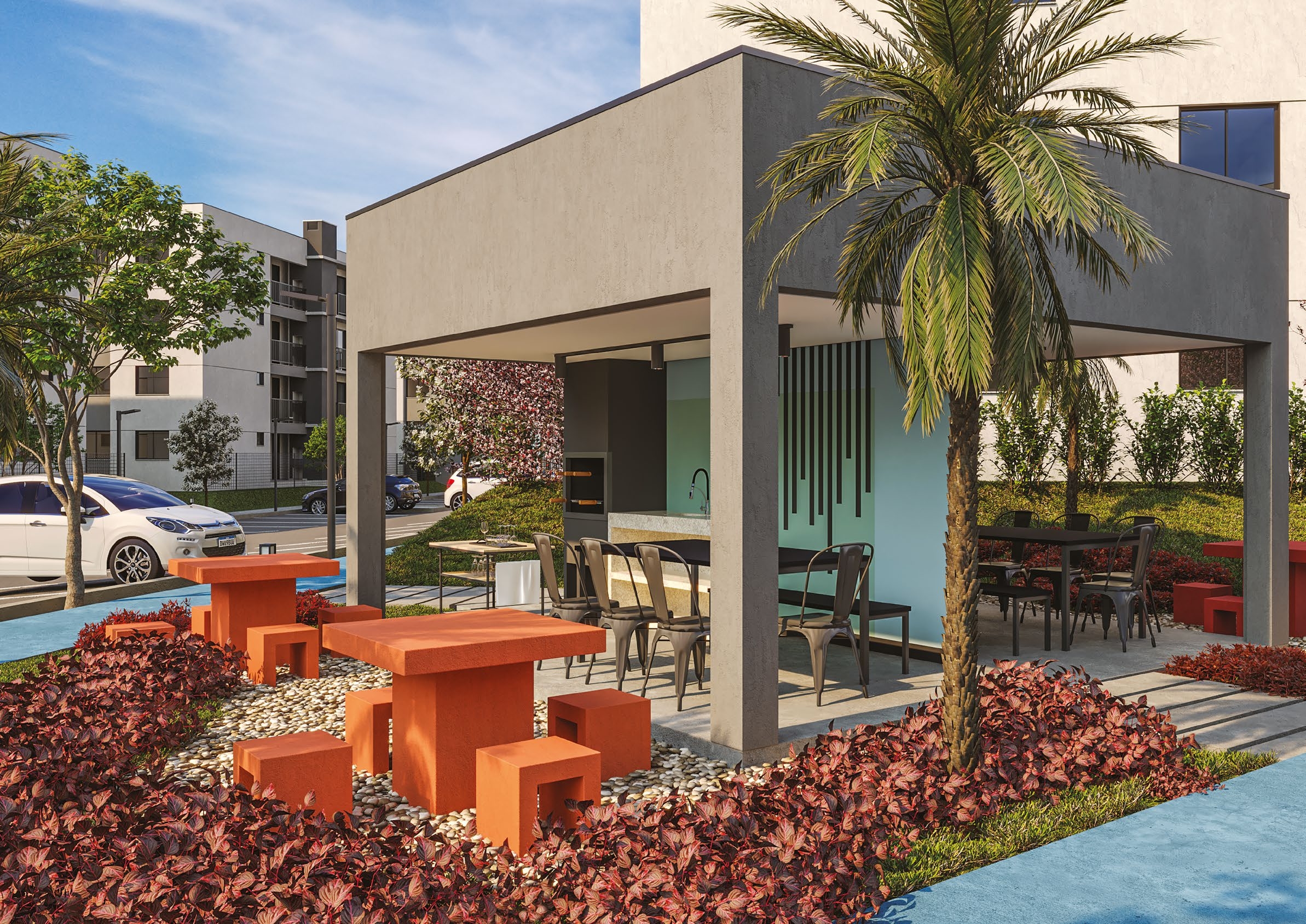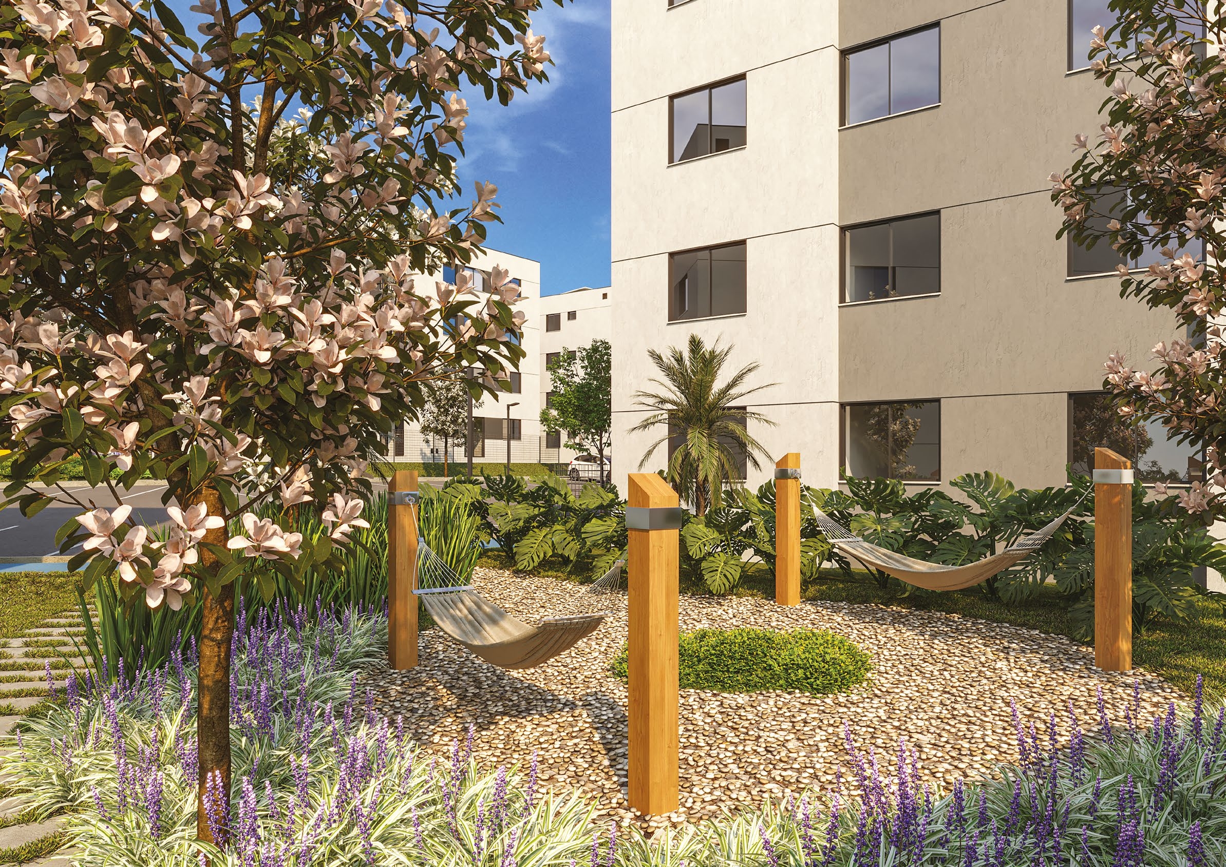 São apartamentos de 2 e 3 quartos, com opções de suíte, sacada ou garden privativo, todos com churrasqueira a carvão. As plantas foram projetadas para trazer funcionalidade e conforto em cada detalhe, com salas integradas e ambientes acolhedores.