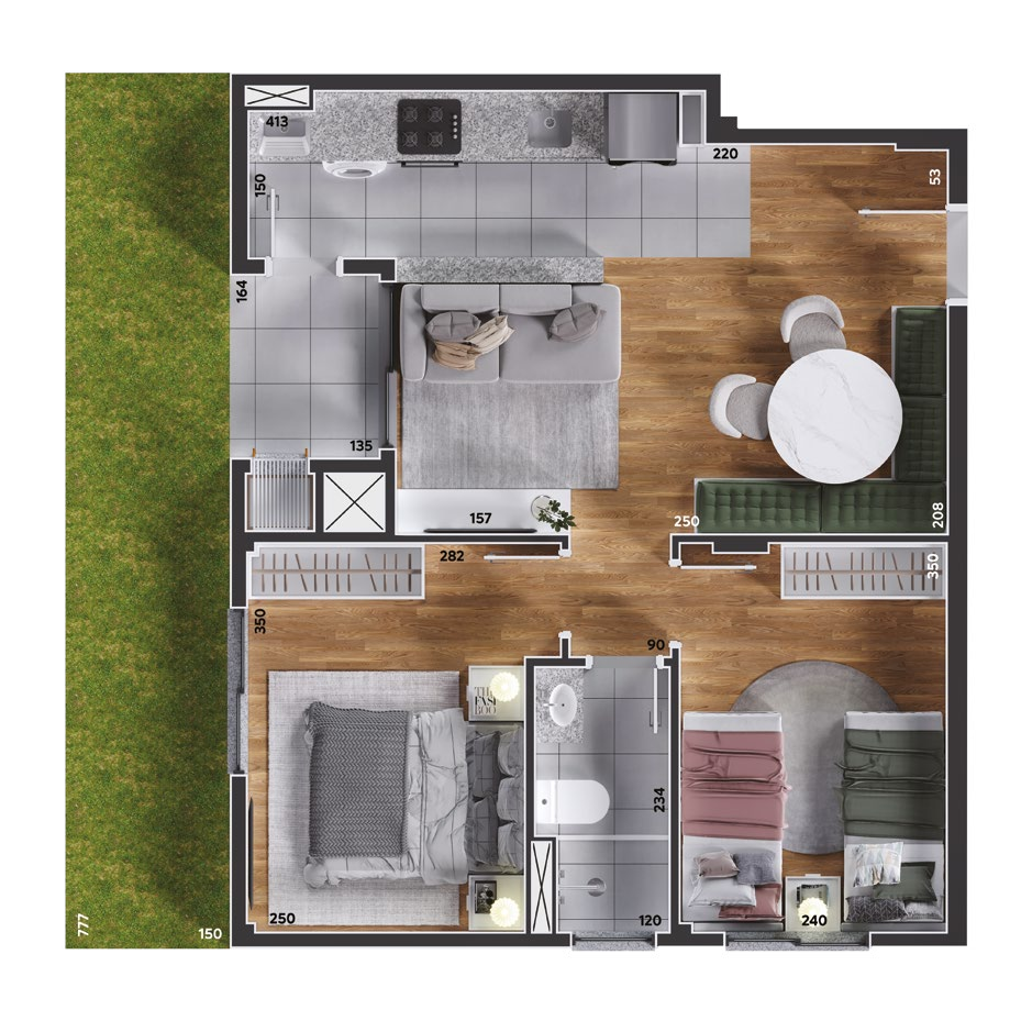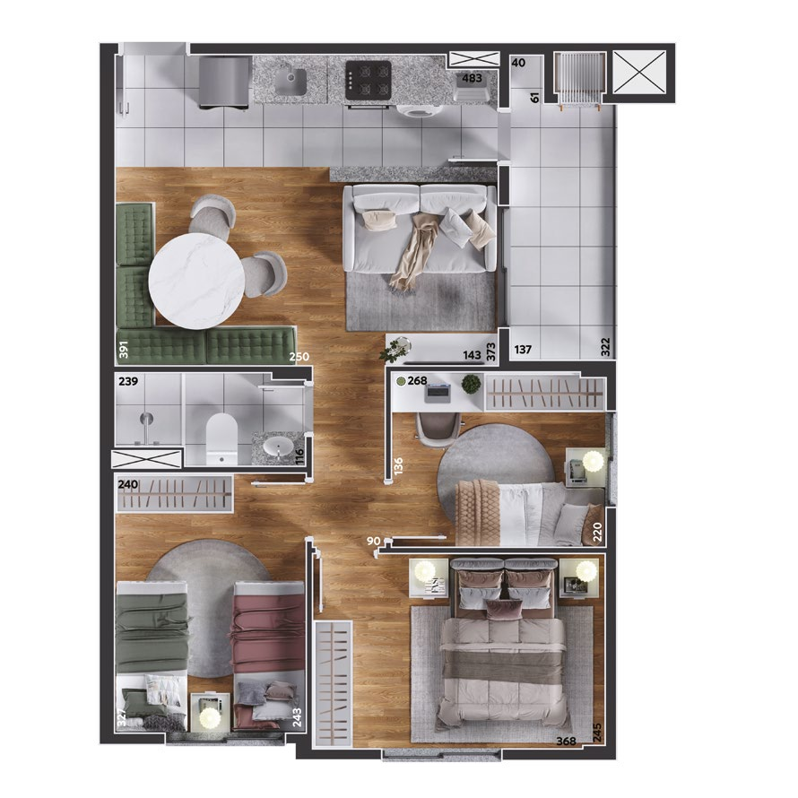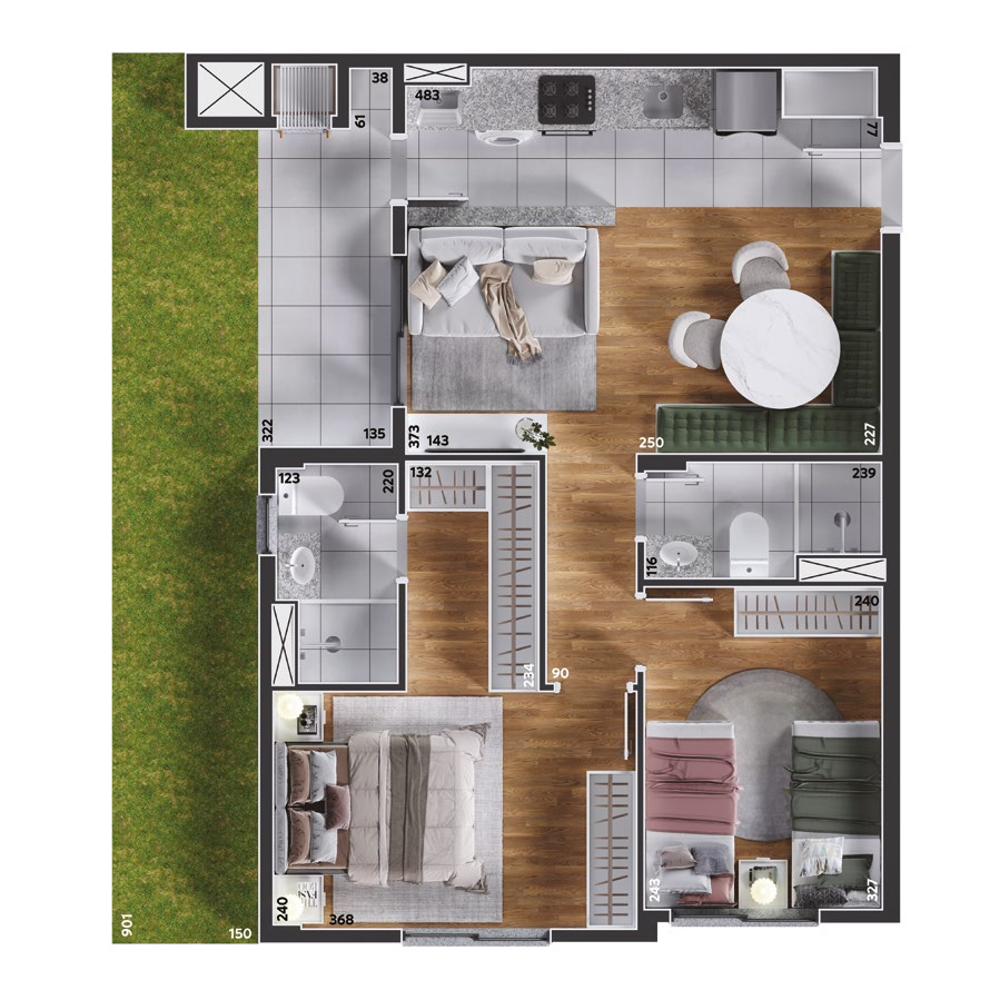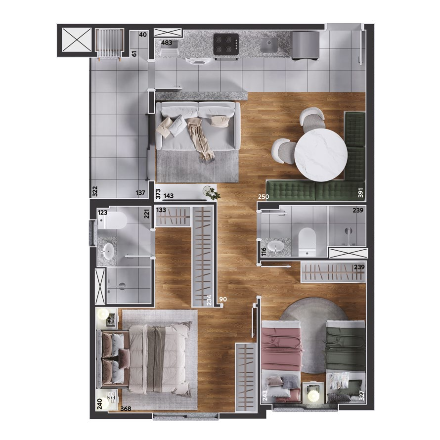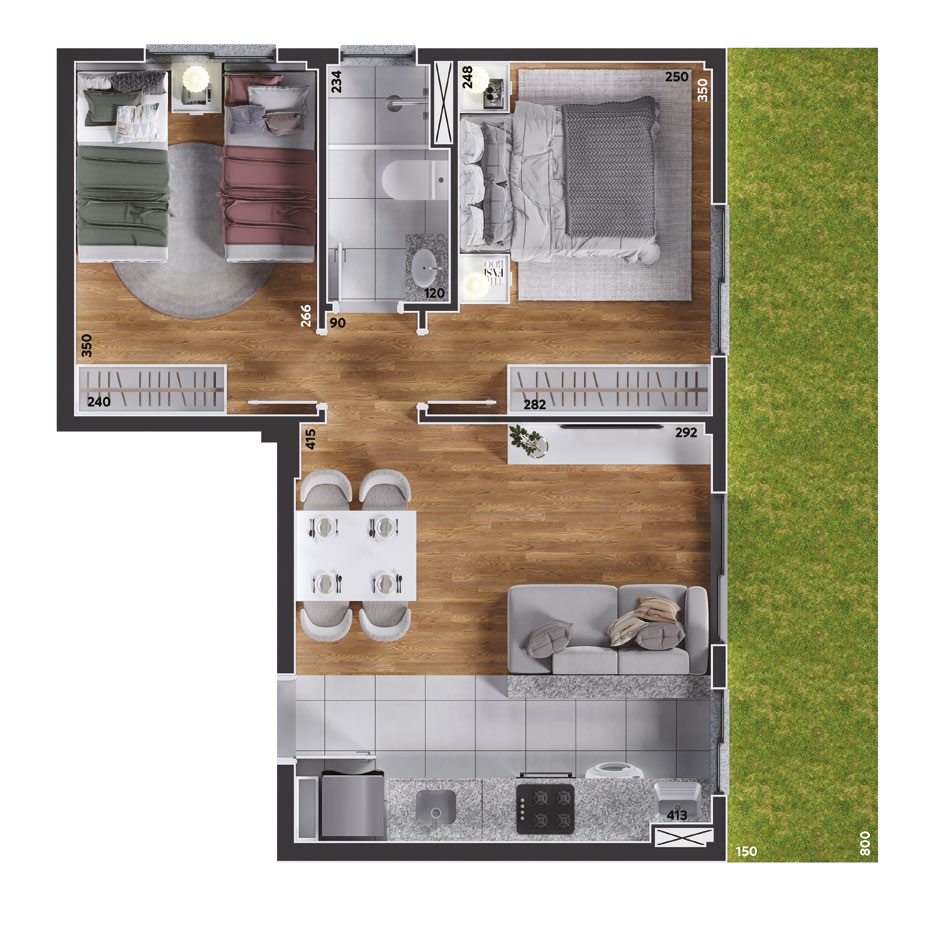 São apartamentos de 2 e 3 quartos, com opções de suíte, sacada ou garden privativo, todos com churrasqueira a carvão. As plantas foram projetadas para trazer funcionalidade e conforto em cada detalhe, com salas integradas e ambientes acolhedores.