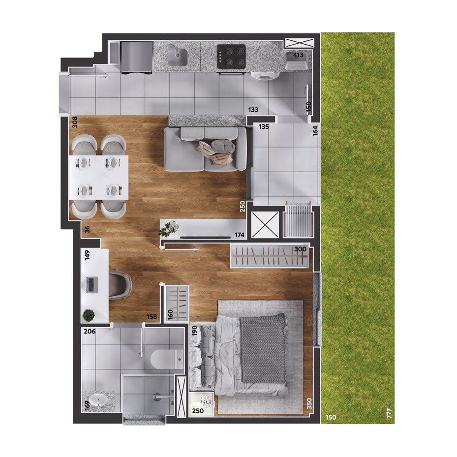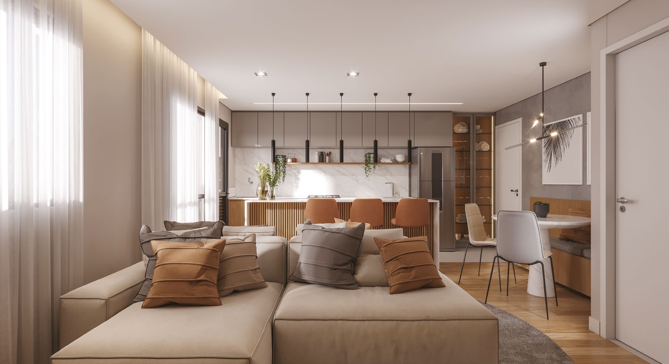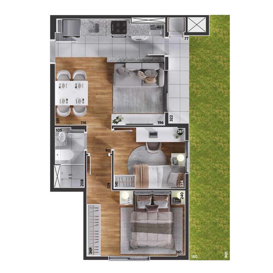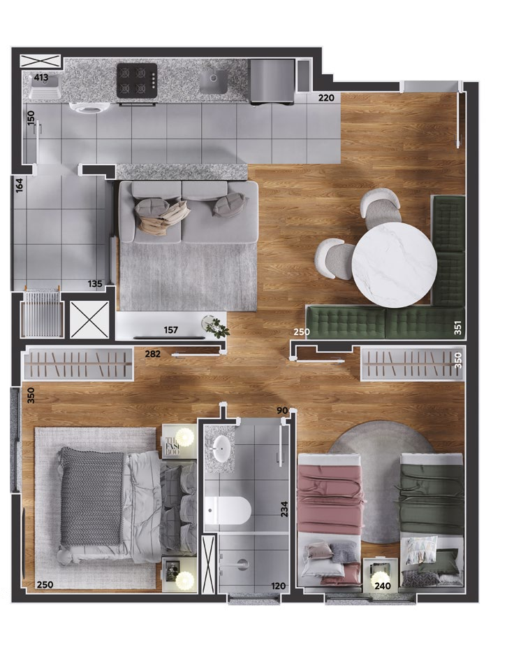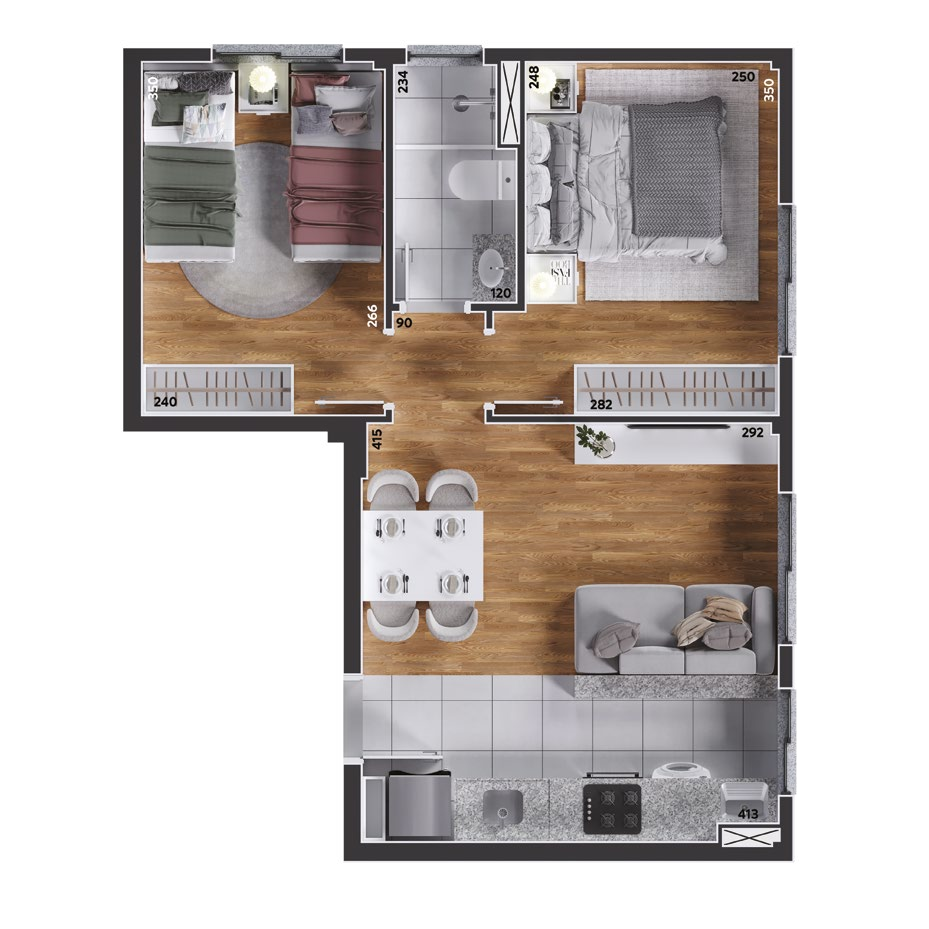 São apartamentos de 2 e 3 quartos, com opções de suíte, sacada ou garden privativo, todos com churrasqueira a carvão. As plantas foram projetadas para trazer funcionalidade e conforto em cada detalhe, com salas integradas e ambientes acolhedores.