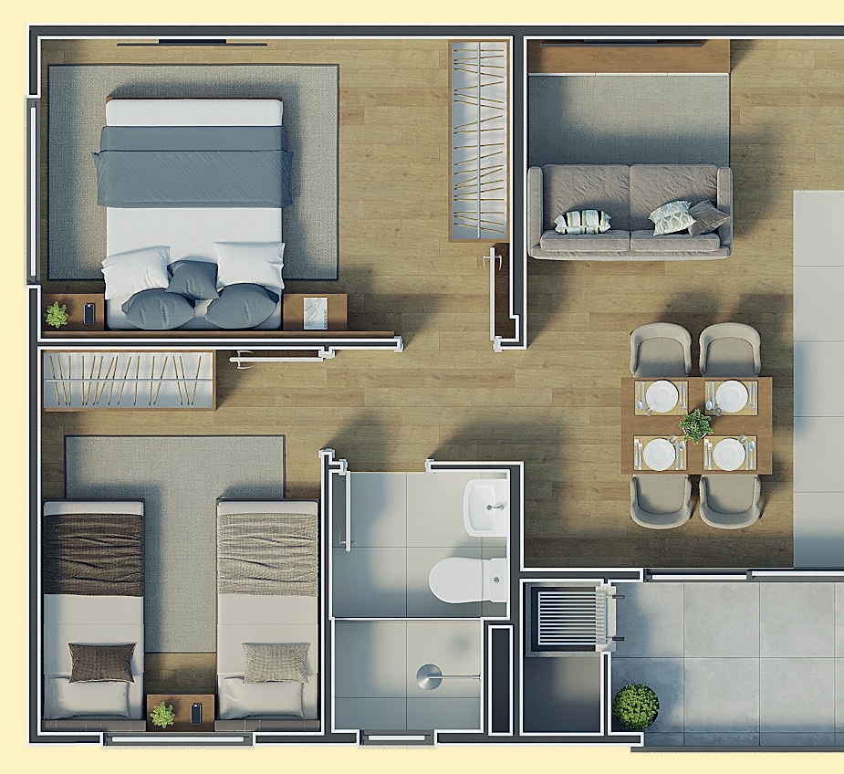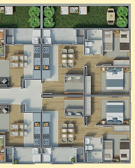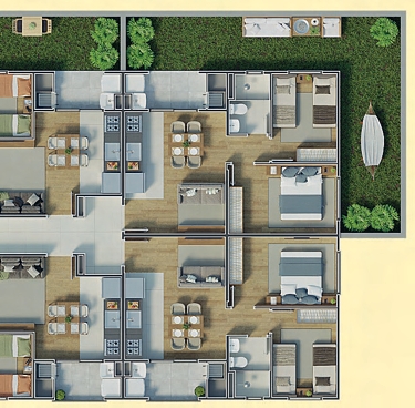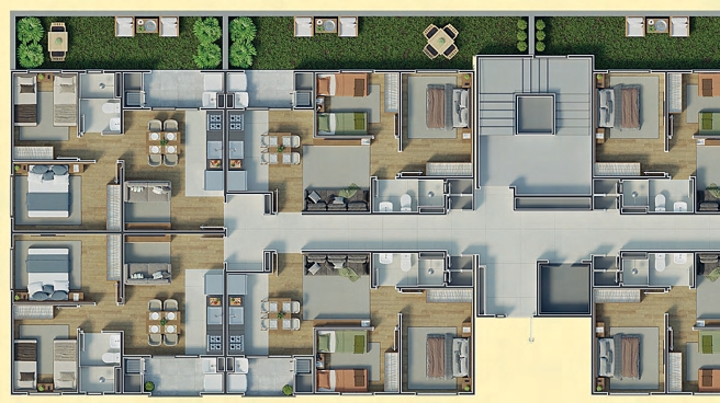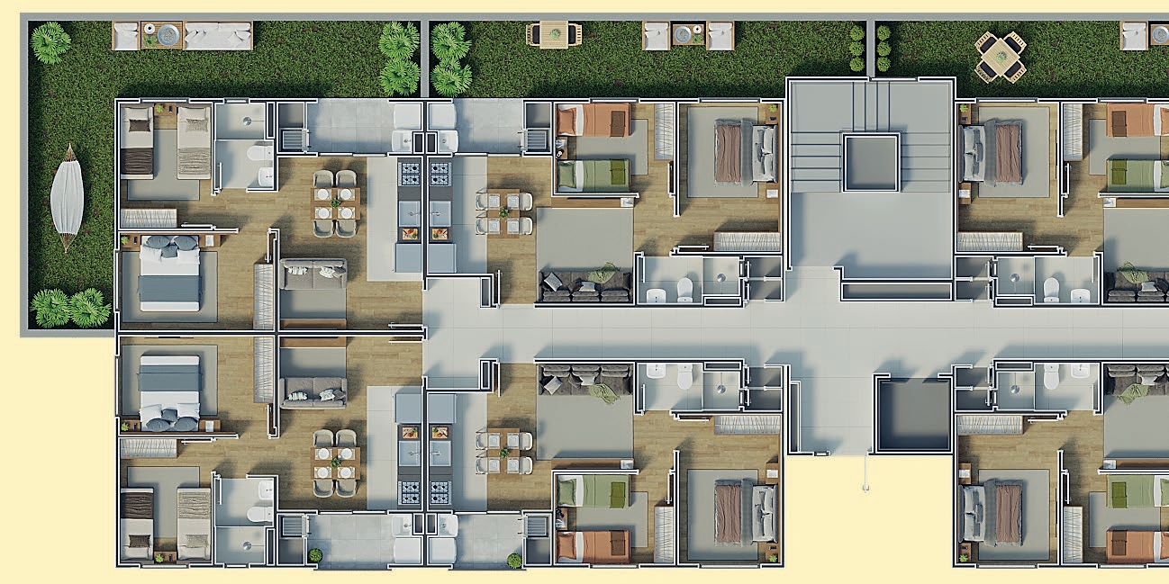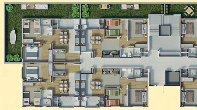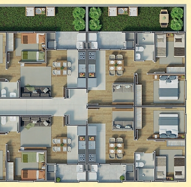 Com 2 blocos e 128 unidades distribuídas em 8 pavimentos, o Florata oferece apartamentos de 42 m² a 43 m², com 2 dormitórios, sacada com churrasqueira, piso cerâmico nas áreas molhadas e infraestrutura para aquecimento a gás