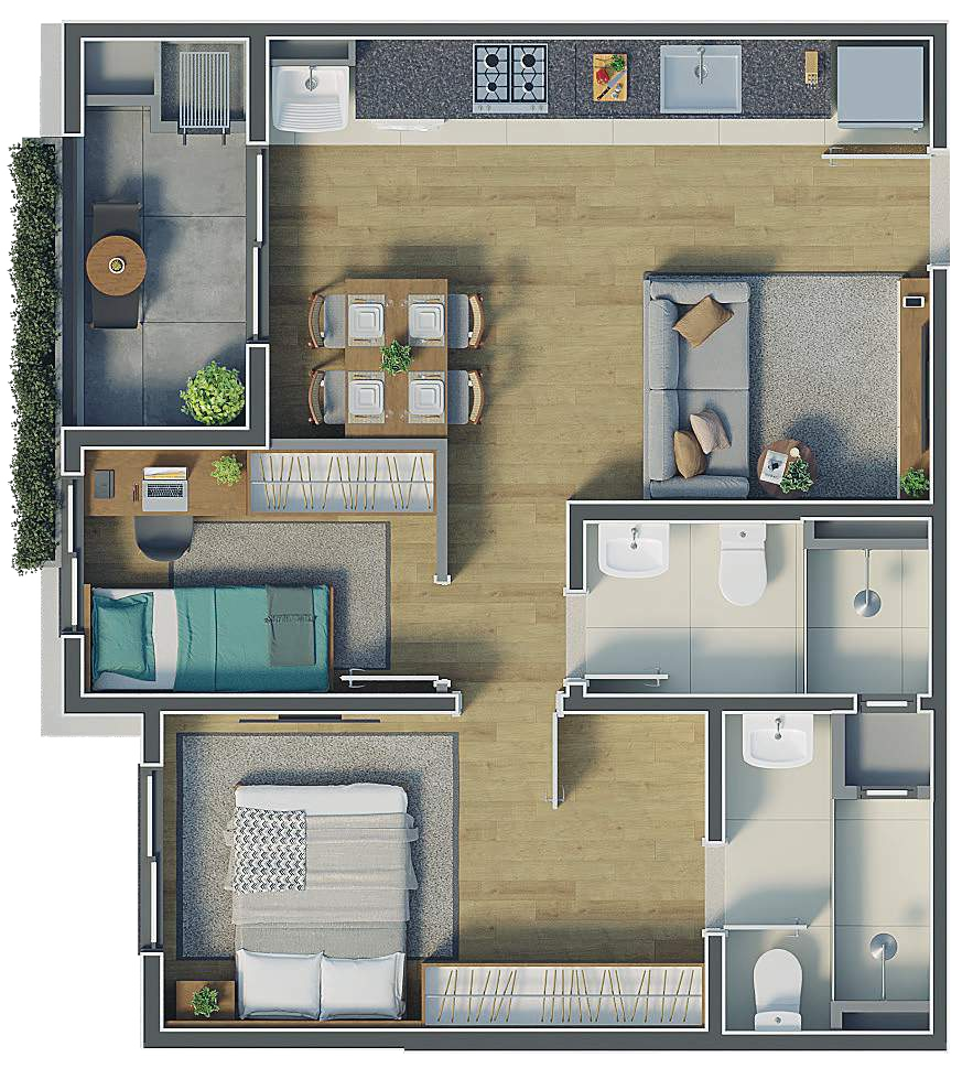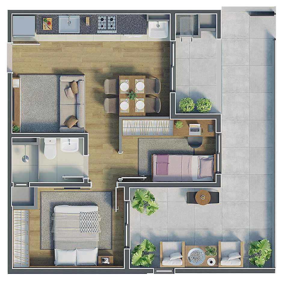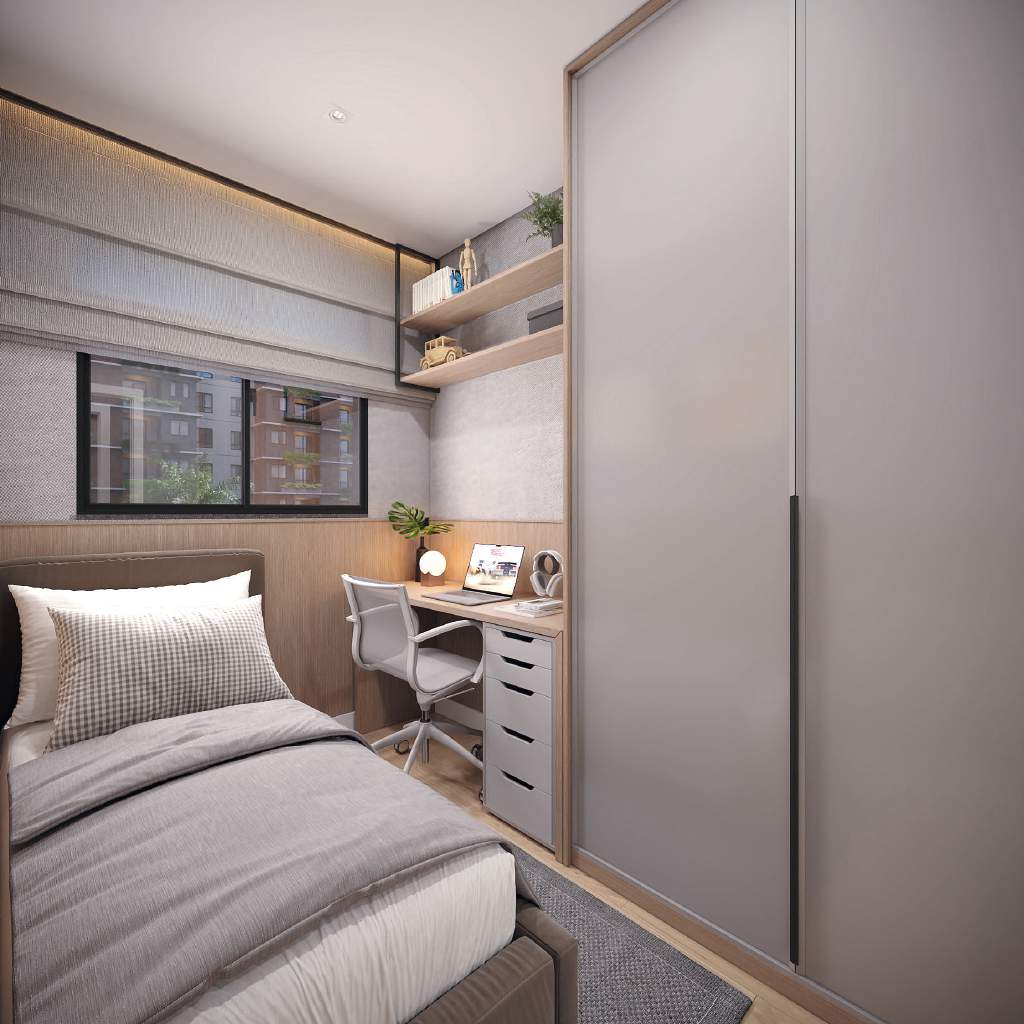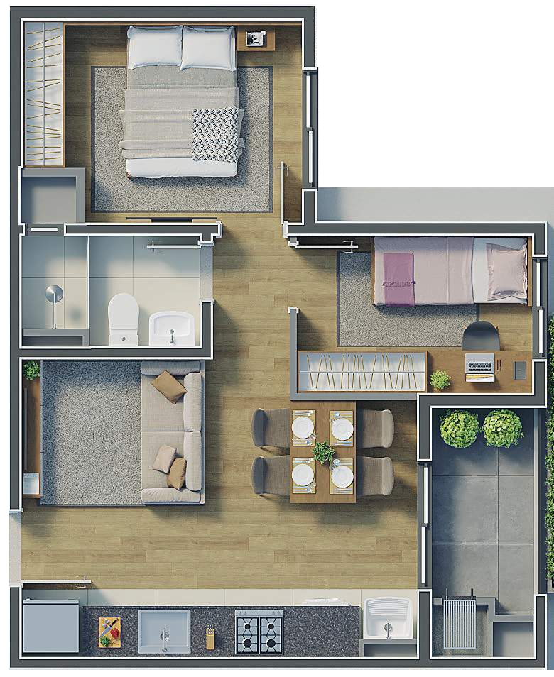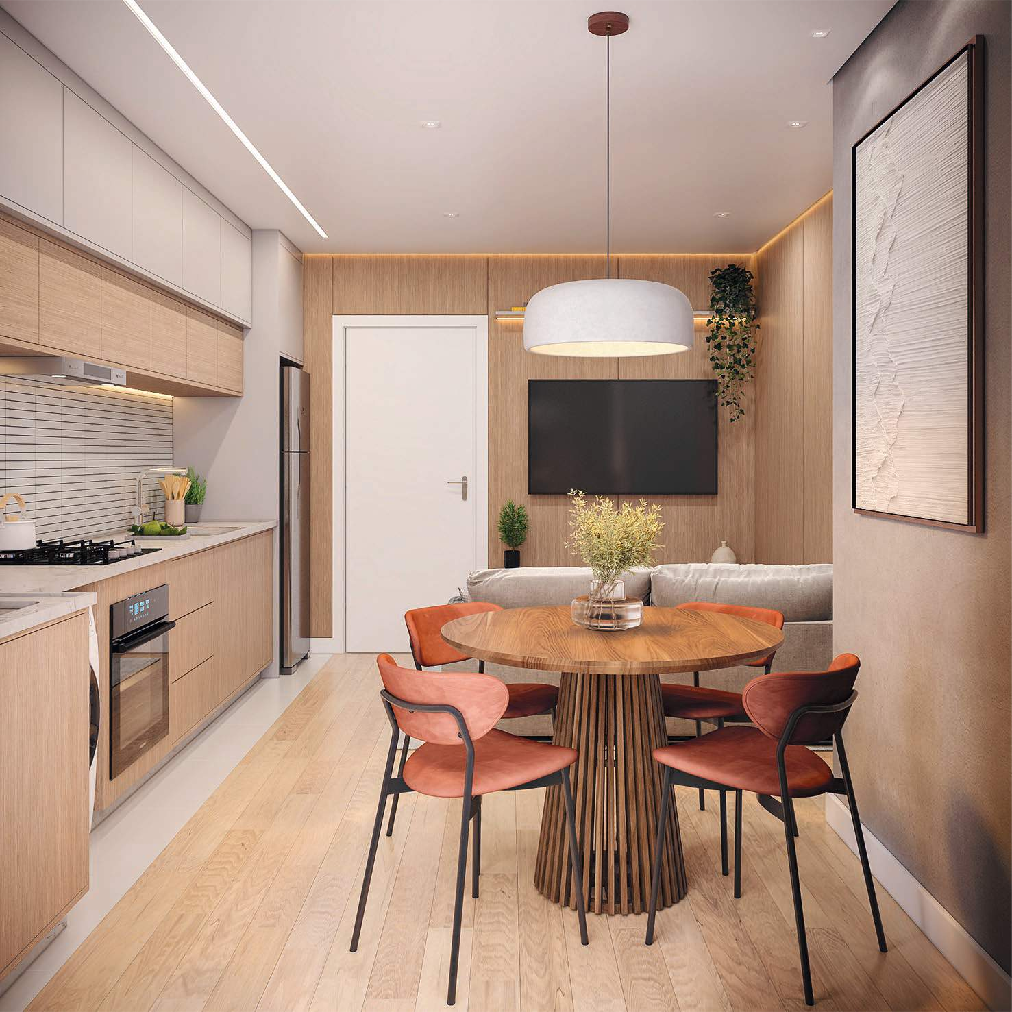 São apartamentos de 1 e 2 dormitórios, com metragens que variam entre 33 m² e 58 m², todos com plantas inteligentes e ambientes bem distribuídos. Algumas unidades contam com garden privativo, enquanto outras oferecem sacada com churrasqueira, garantindo opções que se adaptam a diferentes estilos de vida.